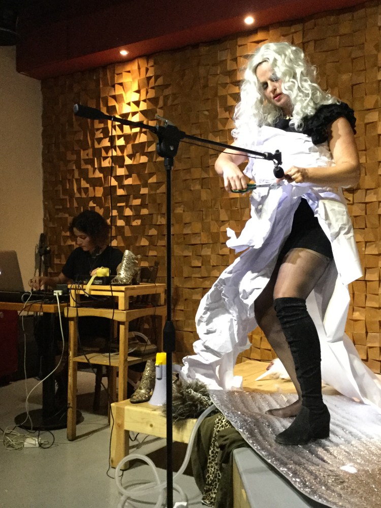 These impulsive fight-or-flight responses are a representation of the Arab identity, of the Lebanese identity. In the Beirut experiments, Nadine uses her voice, body, and objects on stage to build the impulsive and improvised narrative of the performance, Nour plays pre-recorded field recordings in a musical manner. In addition, all the audible elements that are being fed through the microphones are reprocessed live using a computer-generated music sequencer into a spatio-temporal soundtrack.